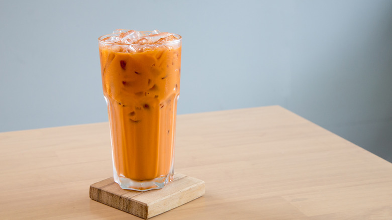 Thai iced tea has no problem being spotted in a crowd. The orange milky drink is easy to identify and has a distinctive flavor that can also be floral, slightly spicy, or faintly tinged with licorice and tamarind (the flavor that separates it from its Indian cousin, chai). However, Thai iced tea's uniting essence is the tooth-enamel-melting sweetness imparted by a heavy-handed pour of sweetened condensed milk.