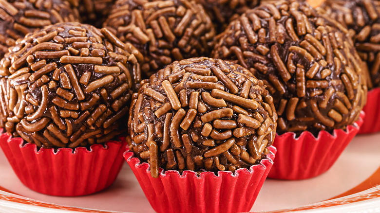 The original recipe contained eggs, but today's brigadeiros have just three ingredients: sweetened condensed milk, cocoa powder, and butter. The ingredients are combined in the correct proportions to form a velvety ball that is then rolled in chocolate sprinkles. Some other versions might be rolled in peanuts or coconut, and the ball itself might contain fruit or nuts. No matter what it's coated or filled with, the confection should be sized to be eaten in just one bite.