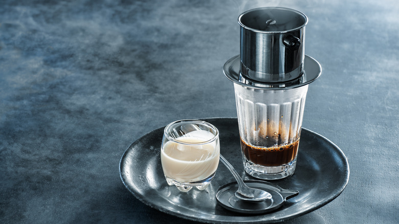 Traditionally, this dark-roasted robusta coffee is brewed using a phin. The phin is a metal filter with four separate parts: a plate, the main body of the filter, a pressing disk, and the lid. The filter rests on top of a coffee mug with a generous glug of sweetened condensed milk in it, and the coffee grounds are in the main body of the phin. Heated water is poured into the phin, dripping through fine metal holes before being pressed through at the end of the brewing time.