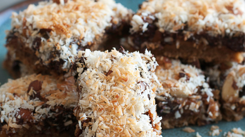 It starts with a base layer of graham cracker crust. From there, add sweetened condensed milk, chocolate chips, coconut flakes, butterscotch chips, and chopped nuts in individual layers. Once baked, each layer melts into the others — the ingredients are no longer in distinct layers but meld together in a gloriously sweet confection.
