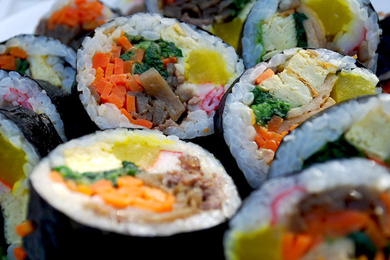 Kimbap is Korea's answer to Japanese maki rolls. Most similar to futomaki, a wide roll filled with egg, pickled vegetables and cooked fish, kimbap is a popular street food option throughout the Korea. Its different taste, texture and lack of ceremony (it's rarely if ever served with the ubiquitous pile of pickled ginger and dab of wasabi) set it apart from its Japanese cousin.