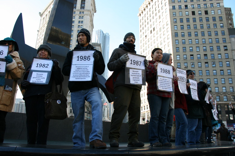 Protestors pointed to a long history of infractions on the part of Monsanto, which they demonstrated by creating a human timeline of the company's history. Monsanto genetically modified its first plant in 1982, but the company's story goes back to the beginning of the 20th century. John Francis Queeny, a pharmaceutical industry veteran, founded the company in 1901 and in 1902 Monsanto sold its first product to Coca-Cola — saccharin, the artificial sweetener that has been linked to cancer. Protestors this morning also referenced Monsanto's role as one of the companies that manufactured Agent Orange, an herbicide used by the U.S. Army in Vietnam that has been proven to caues severe health damage and birth defects.