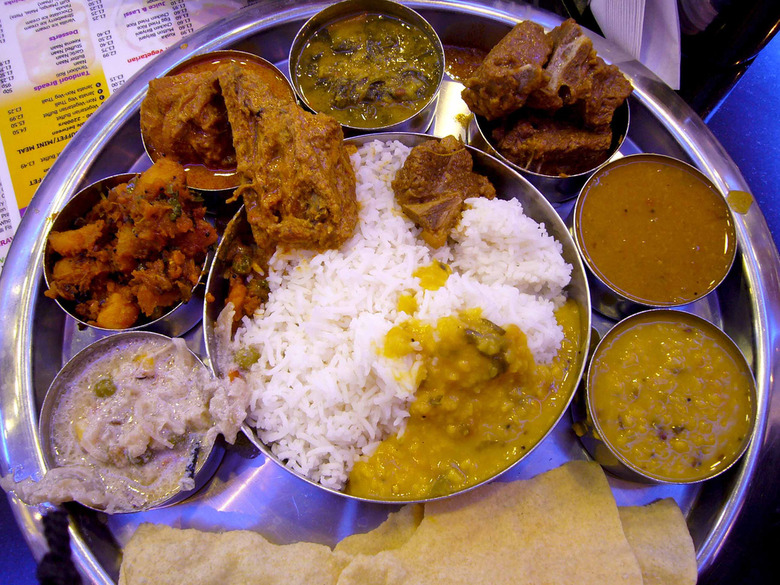 Sustainable: A banana leaf with a heap of rice in the middle, surrounded by drier Indian dishes less prone to run all over the place. Dal may be served in a small separate bowl. One scoops up rice using the thumb and first three fingers (pinky stays clean), then selects another morsel and quickly ferries the whole ordeal to one's mouth before one loses one's grip. Isn't this how one stains one's lungi/sari, you ask? Just like you'll never see a taxi accident in Mumbai despite the utter lack of traffic rules (two honks means "I'm passing you, seriously don't move"), eating-with-hands mishaps are rare. Still, probably best not to try it out on a first date. When the meal is finished, the leaf is discarded.