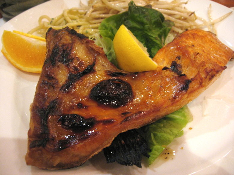 The Japanese eat a lot of fish. Some of it, the amazing primo stuff, is for sushi. Some of it is cut into fillets, some is for soup. And one piece, one very crucial piece, the piece that literally keeps the fish's head on, is brushed with sauce, broiled and totally ignored on the menu. This stops here. If you see salmon collar, yellowtail collar or tuna collar, you must order it. The style of cooking, shioyaki, or "salt-broiled," involves liberal sprinkling with sea salt to draw the moisture out of the skin and allow it to get crispy on the outside while staying moist and flavorful inside.