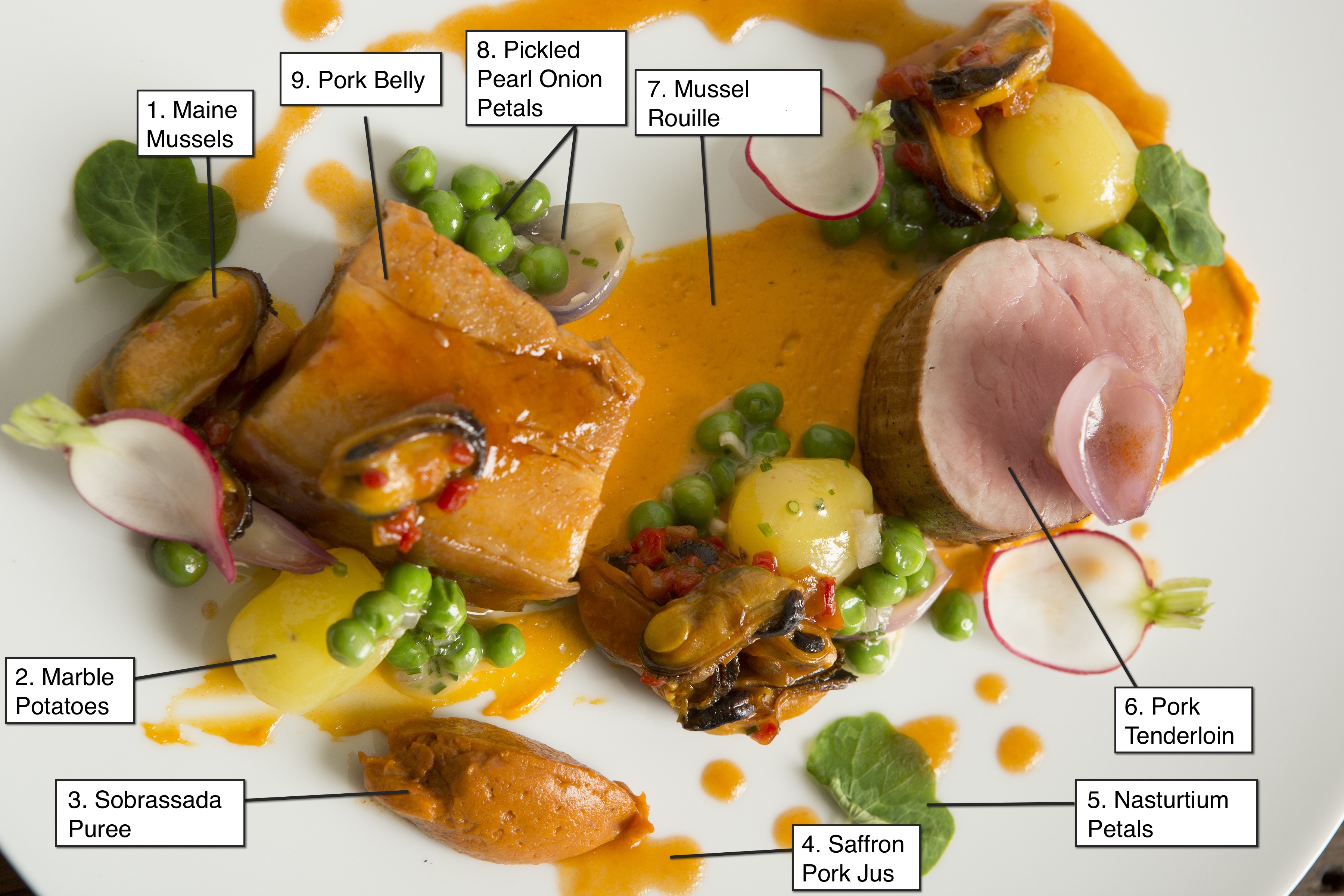 4. Saffron Pork Jus: A light reduction from the belly's braising liquids, infused with saffron threads for color and flavor.