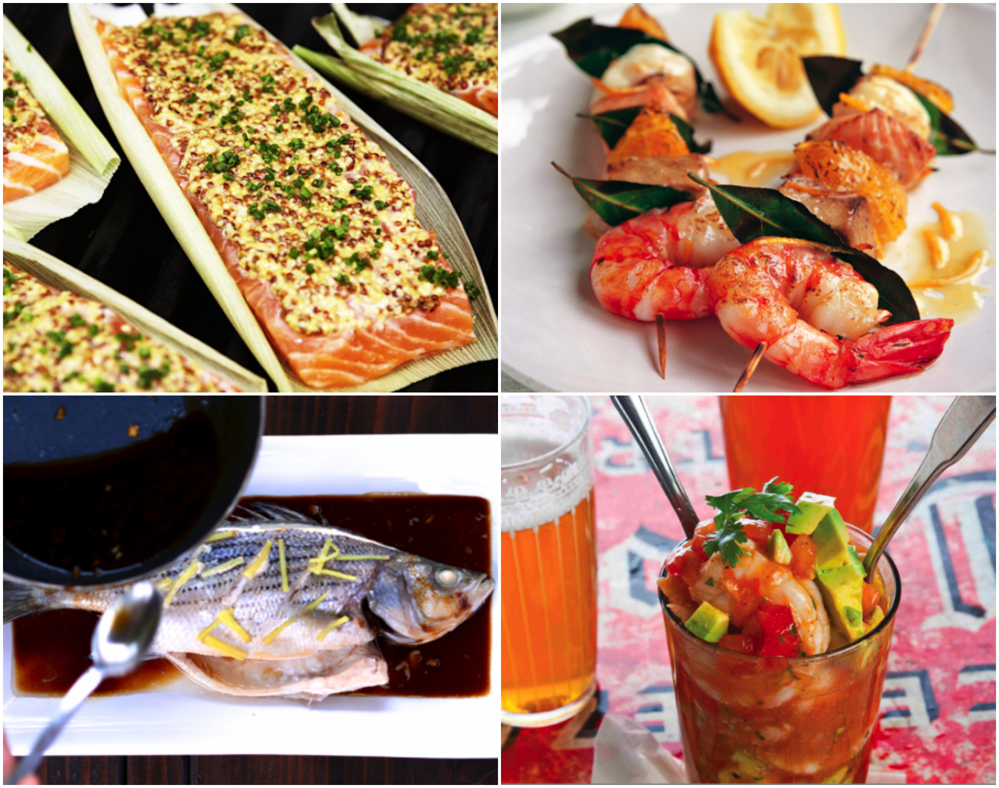 Gone Fishin' (from left): grilled salmon in corn husks, Mexican shrimp cocktail and seafood kebabs