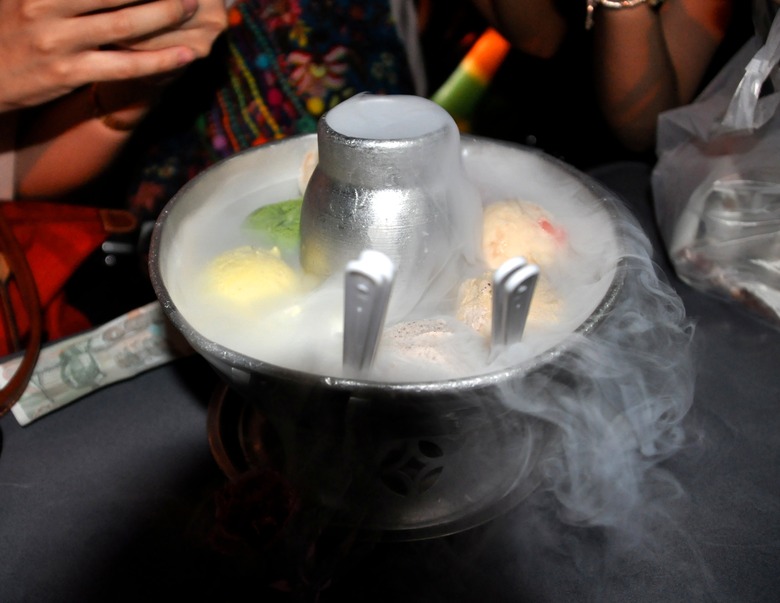 Thai ice cream, or itim, is lighter, less creamy and sweeter than its American counterpart. You'll find flavors like coconut cream, Thai tea and jackfruit. Thai ice cream is often served in creative ways, sometimes in empty coconut shells or in between toasted sweet rolls. We even found a place in Bangkok's Chinatown that serves ice cream in hot pots that would normally be used to serve tom yum soup with liquid nitrogen in the middle for a dramatic effect.