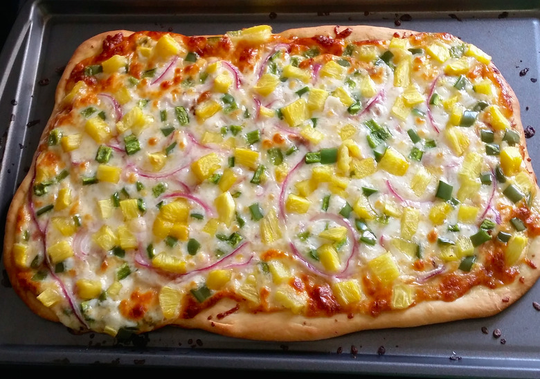 Be reasonable with both your variety and volume of toppings there, Dagwood. If you stick to three or four maximum, you'll be able to taste and appreciate everything more. Once you go past that, you're heading into "hot circle of garbage" territory. If you really have to put eight different things on top, first I urge you to reconsider. Second, if you blew off my first suggestion, just do a little bit of each. That way you don't overload your pizza, and you'll actually be able to pick up the slices without having them collapse. Also, if you're using anything that expels a lot of liquid while cooking (fresh tomato, pineapple, etc.), make sure you cut it small enough that the liquid has a chance to evaporate. Giant pineapple rings or whole beefsteak tomatoes will kill your pizza.